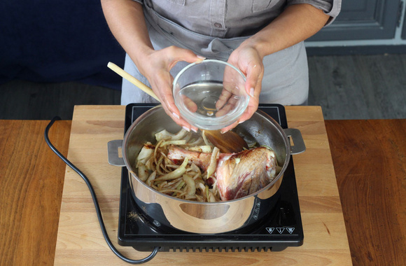 5Versez 75 cl d'eau, portez à ébullition et laissez cuire 1 heure à feu doux en remuant souvent.