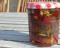 C'est la saison des confitures, pour changer, essayez avec des légumes. Ce mélange courgettes-poivrons est un complément original d'une tartine de chèvre frais servie en entrée avec une petite salade. J'ai tiré cette recette d'une idée d'Isabella Sallusti.
