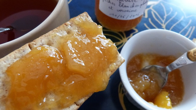 J'aime beaucoup l'association pêche et verveine ce qui m'a donné envie de faire de la confiture avec les pêches plates blanches mes préférées.