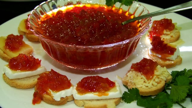 Délicieuse confiture de poivron rouge, oignon et tomate à manger avec tartines et fromage.