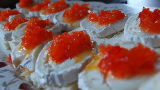 Une confiture de poivron pour accompagner des toasts aux chèvres. Elle a beaucoup de succès auprès de mes invités.