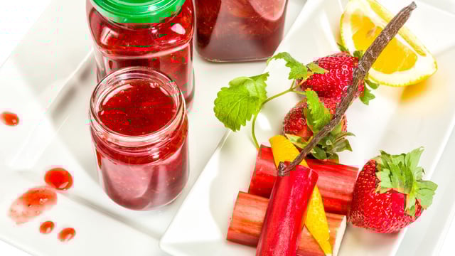 - Couper les fraises et la rhubarbe en petits morceaux et mettre dans 2 saladiers différents. Ajouter 150g. de sucre dans chaque saladier, remuer et laisser dégorger 30mn.Dans une casserole, verser les fraises et la rhubarbe. Gratter la gousse de vanille puis ajouter les grains, la gousse ainsi que l'extrait de vanille dans la casserole. Laisser cuire 1 heure à feu doux.En fin de cuisson, ramollir la feuille de gélatine dans de l'eau froide puis la mélanger à la confiture jusqu'à dissolution.Verser la confiture petit à petit dans les pots.