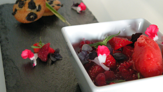 Des fraises et des framboises dans une consommé glacé réalisé à partir de ces mêmes fruits,de la verveine citron et du galanga,...un sorbet à la fraise pour encore plus de fraîcheur,...quelques feuilles de basilic mixées au sirop de sucre et huile d'olive et un financier aux olives confites
