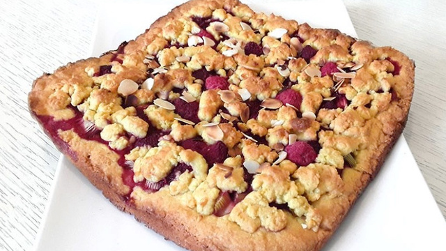 Mettre les framboises et la rhubarbe bien égouttée sur la préparation. Couvrir les fruits avec la pâte restante à la façon d'un crumble, la pâte s’étalera à la cuisson sur les fruits.