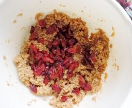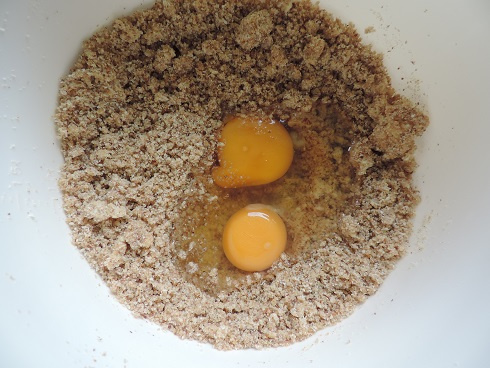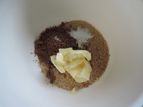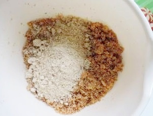 2Dans un saladier, placer la chapelure, le beurre mou, la cassonade, le bicarbonate de soude et mélanger.