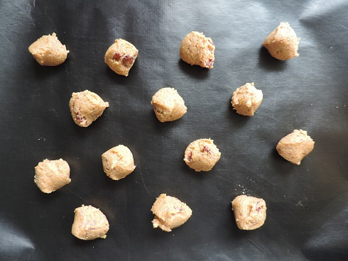 6A l'aide de 2cc, former des boules et les placer sur un papier sufurisé. Enfourner dans un four préchauffé à 180° pendant 10min. Laisser refroidir sur une grille.