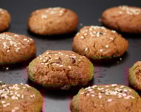 Façonner les cookies et les déposer sur une plaque de cuisson recouverte de papier sulfurisé. Parsemer de graines de sésame et enfourner pour 10 à 15 minutes. Les cookies doivent être dorés. Laisser refroidir sur une grille et déguster.