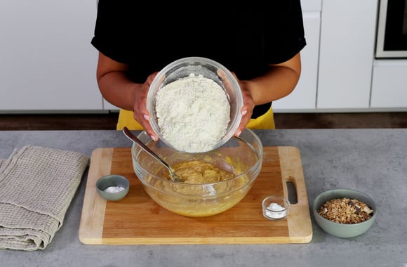 4Lissez la pâte, puis ajoutez la farine tamisée avec le bicarbonate de soude et la levure chimique.