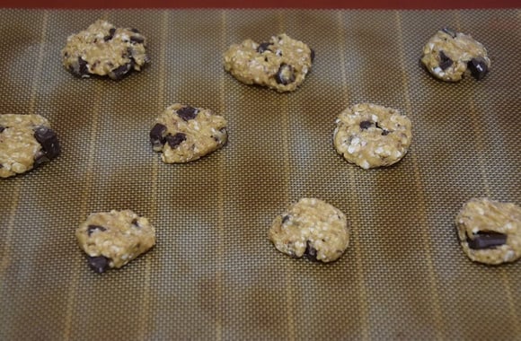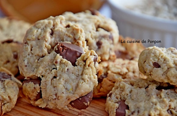 NB: Pour changer, à la place des pépites de chocolat, j'ai coupé du chocolat noir en morceaux et c'est super bon! La quantité des ingrédients est facile à retenir: 80g de sucre, de flocons, de farine+maïzena, de beurre de cacahuète, de pépites! sans oublier l'oeuf.