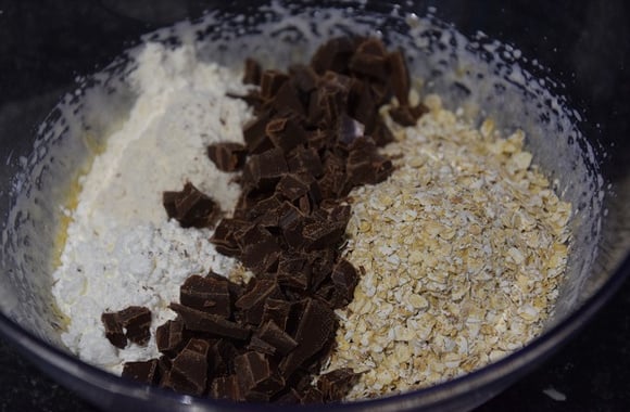 3Ajouter les flocons d'avoine, la maïzena et les pépites de chocolat et mélanger.