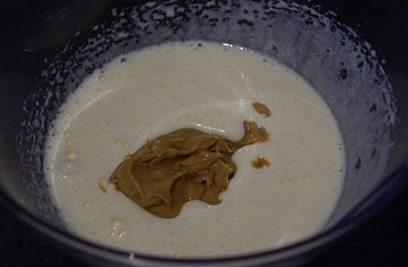 2Ajouter le beurre de cacahuète (si il est trop épais, le passer 1 min au micro ondes, puissance moyenne) et mélanger.