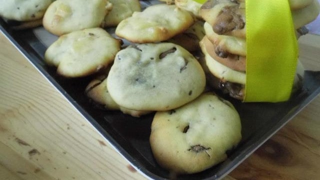 Si toute la pâte ne rentre pas sur une plaque, remettre la préparation au frigo pendant que la première fournée cuit. Les cookies se conservent 1 mois dans une boite bien fermée.
