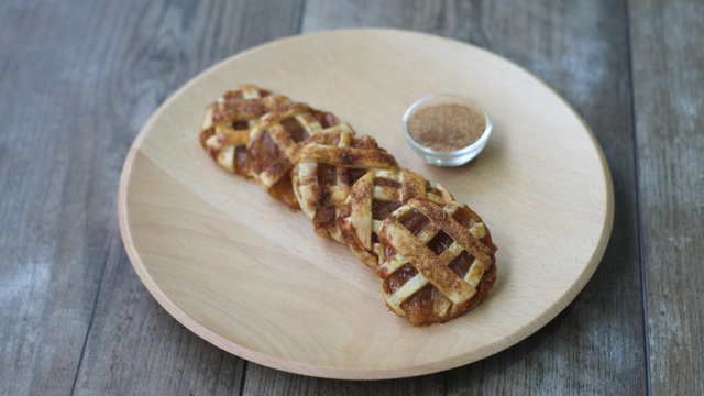 Sur le plan de travail, étaler un disque de pâte sablée sur un papier sulfurisé, saupoudrer de sucre cassonade., puis ajouter les pommes en les étalant bien et en laissant 1 cm de bord tout autour. A l’aide d’une roulette à pizza, découper le deuxième disque de pâte sablée en bandes de 1 cm de largeur. Disposer les bandes de pâtes sur la tarte, en faisant des croisillons, jusqu’à recouvrir toute la tarte. A l’aide d’un emporte-pièce rond de 6 cm de diamètre, découper des ronds dans la tarte, afin d’obtenir vos cookies. Les transférer sur une plaque de cuisson, en gardant la feuille de papier sulfurisé en dessous.