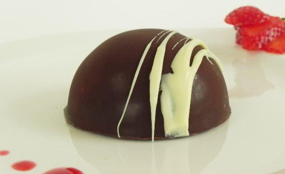 Coque de chocolat noire rempli de mousse au chocolat blanc et d'une fraise cachée.