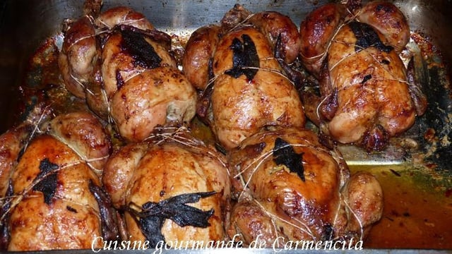 Enfourner pour 40 min environ en les tournant et en les arrosant souvent avec leur jus, allongé d'un peu d'eau (environ 1 tasse à café). Retirer la ficelle et les cures dents, et disposer les coquelets coupés en deux dans un plat de service, et verser le jus rendu dans une saucière. Servir aussitôt.