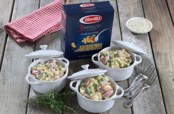 11Dressez les coquillettes dans des petites cocottes puis saupoudrez de parmesan et servez aussitôt.