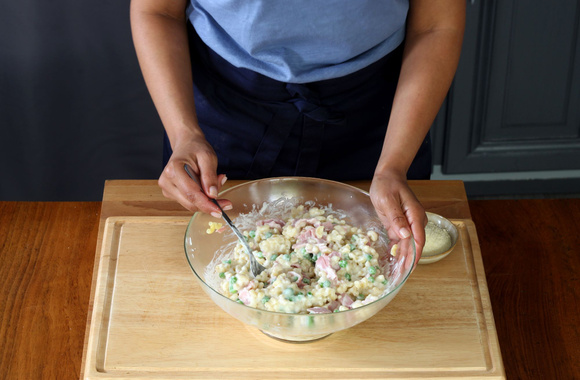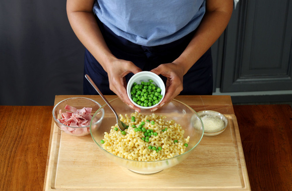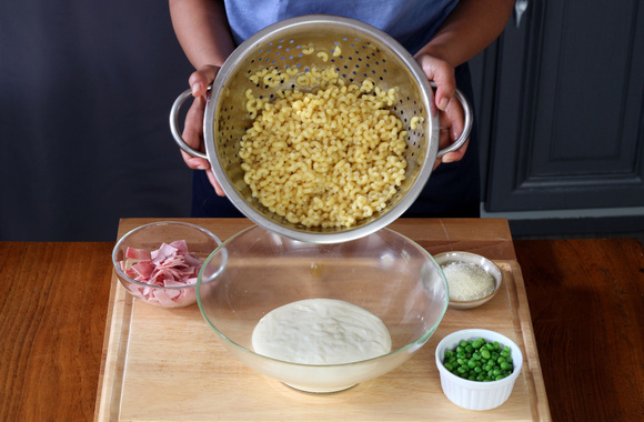7Égouttez les coquillettes dans une grande passoire, puis versez-les dans le saladier avec la béchamel et mélangez.