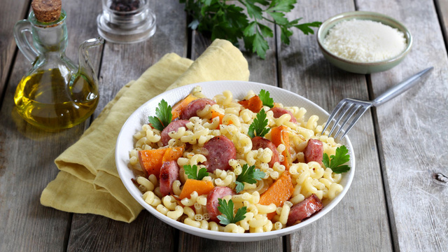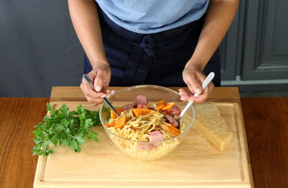 9Ajoutez immédiatement les légumes rôtis et les rondelles de saucisses grillées, mélangez.