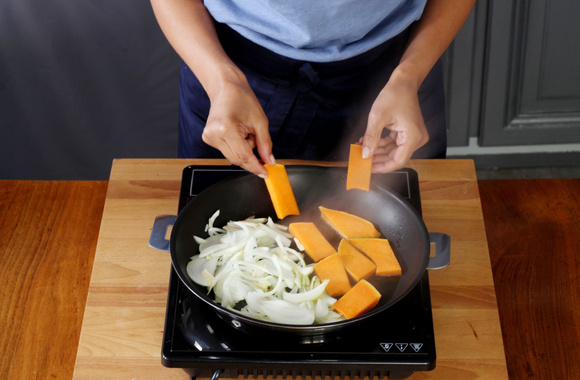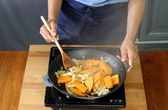 3Faites chauffer 4 cuillerées à soupe d'huile dans une grande poêle, ajoutez-y les oignons, l'ail et les tranches de potiron.