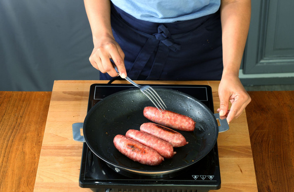 5Dans une autre poêle, faites griller les saucisses avec le restant d'huile.