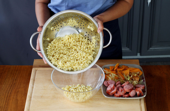 8Égouttez les coquillettes dans une grande passoire, puis versez-les dans un grand saladier.