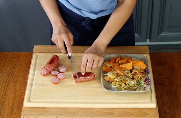 6Coupez les saucisses grillées en rondelles et réservez-les avec les légumes.