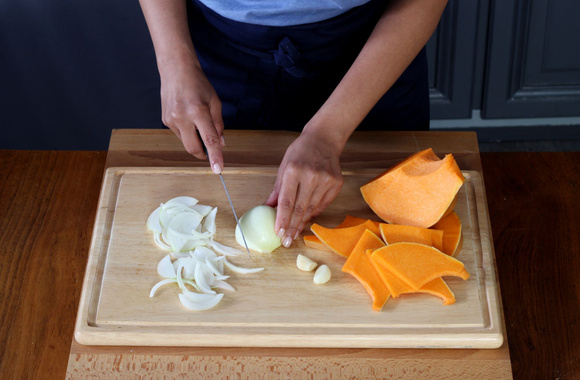 2Émincez l'oignon et l'ail puis coupez le potiron en fines tranches.
