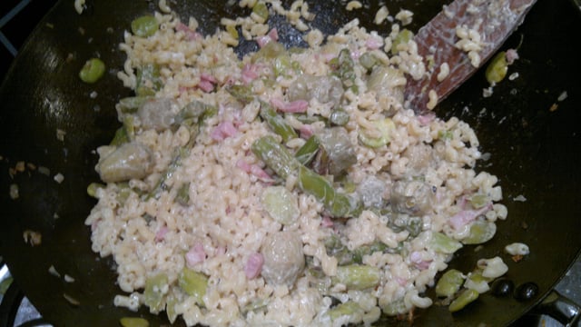 Dans un wok, faire chauffer de l'huile. Faire revenir les échalotes coupées en petits morceaux, et l'ail écrasé et les lardons. Lorsqu'ils deviennent translucides, ajouter les asperges coupées en morceaux, les fèves ainsi que les coeurs d'artichauts.