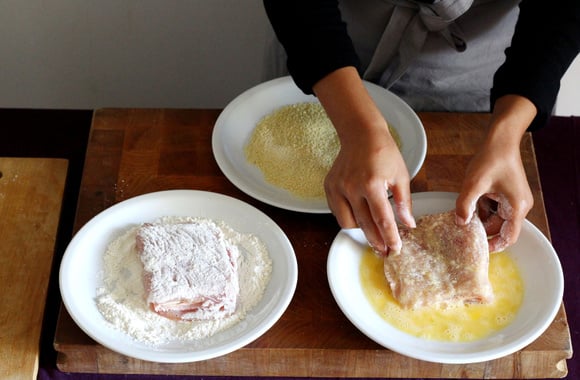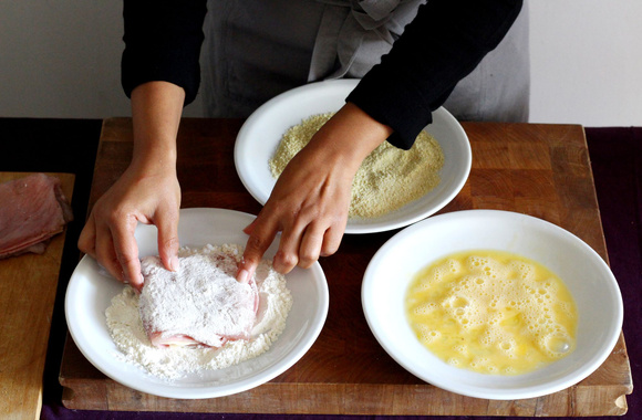 6Préparez trois assiettes creuses, une pour la farine, une pour l'oeuf battu et une pour la chapelure. Passez les cordons bleus dans la farine.