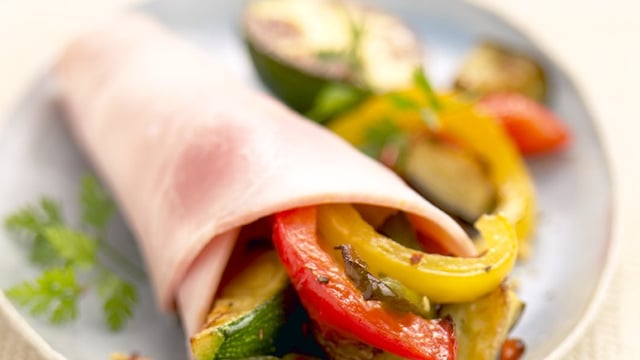 Disposez les légumes grillés au centre de chaque tranche de jambon, roulez délicatement et servez.