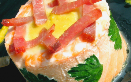 Couper le saumon dans la longueur pour la corolle . Enrouler celui - ci à l'intérieur d'un cercle préalablement beurré . Une fois effectué faire de même avec le morceau de sabre . Ajouter de la purée de lentilles au milieu , et quelques copeaux de lomo . Enfourner à four chaud ( 180°)pendant huit à dix minutes environ .