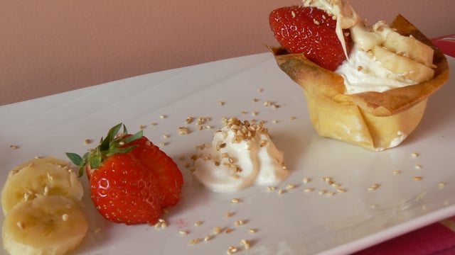 Mettre du chocolat blanc dans le fonds de la corolle, y mettre de la chantilly avec une poche à douille, ainsi que des fraises et sur le dessus terminer avec une fraise et 3 rondelles de bananes.