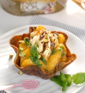 Au moment de servir, garnir chaque corolle d'une rosette de Crème glacée Carte d'Or® Façon Glacier Saveur Crème Brûlée et de quartiers de pêches poêlées.