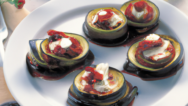 Prendre des ramequins légèrement huilés, tapisser l'intérieur avec 2 feuilles de brick superposées, déposer une couche d'aubergines puis 2 tranches de magret fumé, puis une couche de mozzarella , répéter l'opération en terminant par de la mozzarella. Découper l'excédent de feuilles de brick pour former des corolles et mettre au four pendant 10 minutes environ le temps que les feuilles dorent et que le fromage fonde. Servir aussitôt