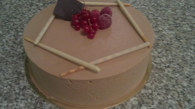 Réaliser une crème anglaise, la verser sur le chocolat noir. Réserver au froid dans un cercle de 18cm.