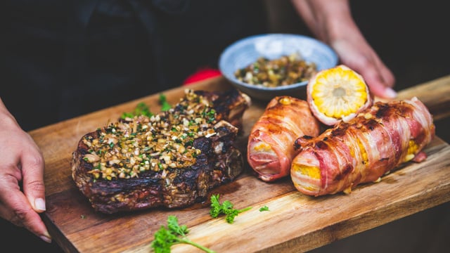 Étalez la sauce teriyaki sur le bacon et placez les épis de maïs à côté de la côte de bœuf et faites-les cuire 10 minutes en les retournant de temps en temps. Servez la côte de bœuf avec les épis de maïs.