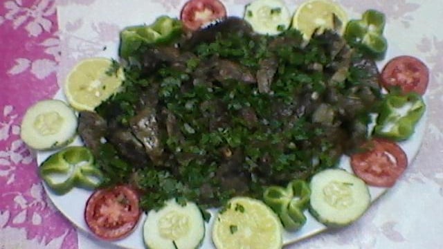 Garnir de persil et d'oignon finement découpés, de citron, tomate, piment, concombre.