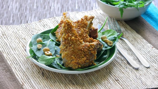 Passer ensuite les côtes d'agneau dans le mélange noisettes/chapelure, afin de les paner de tous les côtés.