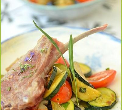 Cuire les côtes d'agneau avec un filet d'huile à feu vif 3 minutes sur chaque face. Sortez les côtes d'agneau de la poêle et laissez-les reposer 2 minutes sur une petite grille avant de les servir. Disposez les légumes au fond des assiettes et posez les côtes dessus. Servir aussitôt.