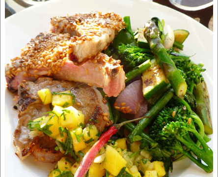 Parallèlement faire revenir dans un wok tous les légumes dans un peu d'huile d'olive et les garder croquants. Déglacer au moment de servir avec un trait de vinaigre de mangue et assaisonner bien.