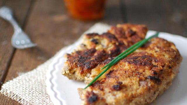 Servir les côtes d'agneau panées accompagnées du chutney.