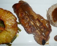 Réchauffer le riz, servir la côte de porc avec les légumes accompagnés d'une tranche d'ananas, ainsi que le riz et la sauce.