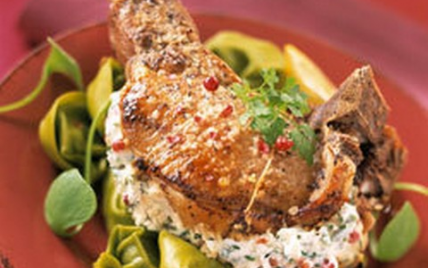 Placer les côtes de porc farcies dans un plat et mettre à cuire 20 min dans un four à 150°C (démarrage à four froid).