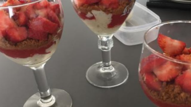 Dans chaque coupe : Placer d'abord la préparation au mascarpone. Ensuite rajouter du spéculoos préalablement émiettés. Puis le coulis de fraises. Répéter l’opération 1 fois, puis rajouter des fraises que vous avez coupé pour la petite touche déco.