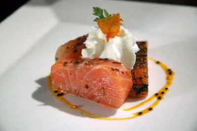 Dresser les cœurs de saumon au milieu de l'assiette en laissant une place pour l'artichaut au curcuma au centre et ajouter l'émulsion de pomme de terre au-dessus.