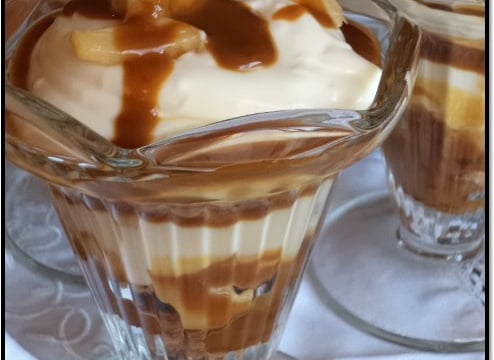 Faire deux couches et terminer par des pommes et du caramel.