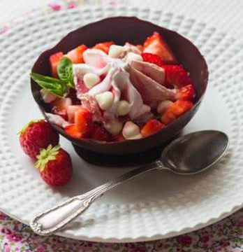Préparez une plaque recouverte de papier cuisson. A l'aide d'une cuillère, déposez un disque de chocolat fondu d'environ 5 cm de diamètre sur la feuille. Prenez un ballon, huilez-le à l'aide d'un papier absorbant imbibé d'huile alimentaire puis plongez-le dans le chocolat afin de le napper et former un bol. Déposez le ballon sur le disque de chocolat qui servira de pied. Recommencez l'opération avec les autres ballons. Laissez durcir puis placez au congélateur pendant au moins 2 heures.
