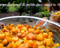 Peler et découper la courge butternut et la patate douce en dés et les mélanger avec l'huile d'olive, saler, poivrer , saupoudrer d'une demi c à café de ras el hanout , ajouter quelques branches de thym et remuer, vous pouvez mettre le tout dans un sac congélation pour mélanger plus facilement .