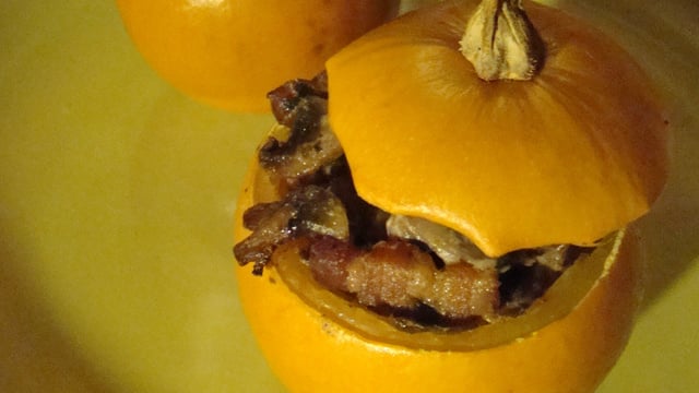 Garnir les pommes d'or de la farce, fermer avec le petit chapeau mettre les pommes d'or dans un plat, ajouter 1cm d'eau dans le fond et mettre au four pendant 15 min.