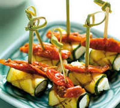 Etalez les courgettes grillées à plat sur une planche ou sur une assiette puis placez des morceaux de feta sur une extrémité de la tranche de la courgette. Ajoutez quelques germes d'asperge à l'huile de sésame puis roulez la préparation comme un nem. Piquez le tout à l'aide d'une pique en bois. Vous pouvez servir ces rouleaux sur une assiette et les arroser d'un filet d'huile d'olive.